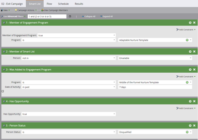- Consider the actions that a lead might take to be pulled out of a nurture and build those out in the campaign’s smart list. For example, my top of the funnel nurture will pull leads out when they fall out of the “Emailable” smart list (or segmentation), or qualify for the middle of the funnel nurture, or become associated to an opportunity within SFDC, or are disqualified. Pay attention to the filter logic here.