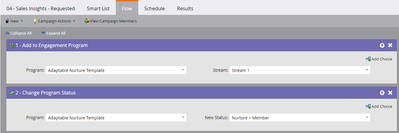 - When you have other smart campaigns and programs that might direct leads to your engagement program, you can use a “Campaign is Requested” trigger. You could then add a “Request Campaign” flow step to all the smart campaigns in external programs that may need to add leads to your nurtures.