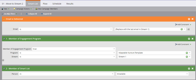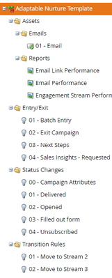 - Once you have your shell streams, create a folder for the Transition Rule smart campaigns to live, and then you can begin creating the smart campaigns. Consider what actions somebody has to take to transition from one stream to another. A simple nurture will transition somebody between streams after they have finished all the content in their current stream. However, you can also use action triggers to transition somebody when they download an asset from their current stream, reach a certain score threshold, etc.