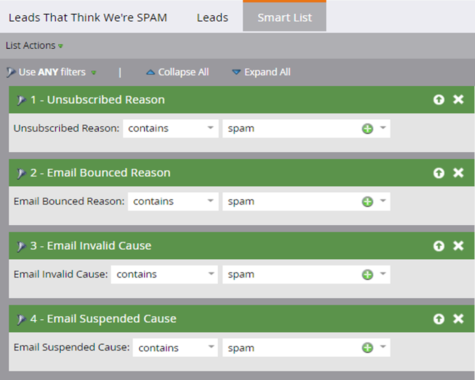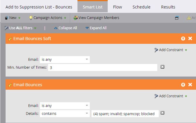 Email Bounces - email is any, reason contains: spam, invalid, spamcop, blocked