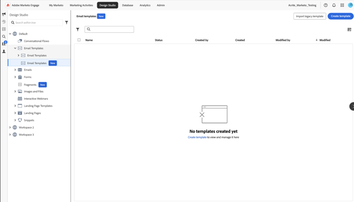- Navigate to Email Templates [New]: In Marketo Engage, go to Design Studio > Email Templates [New] and click "Create New" button.