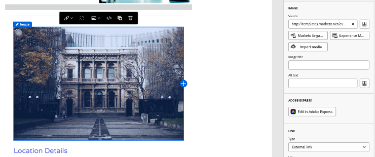 - Select the image, click the image icon, and choose a new image from “Marketo Engage Assets”.