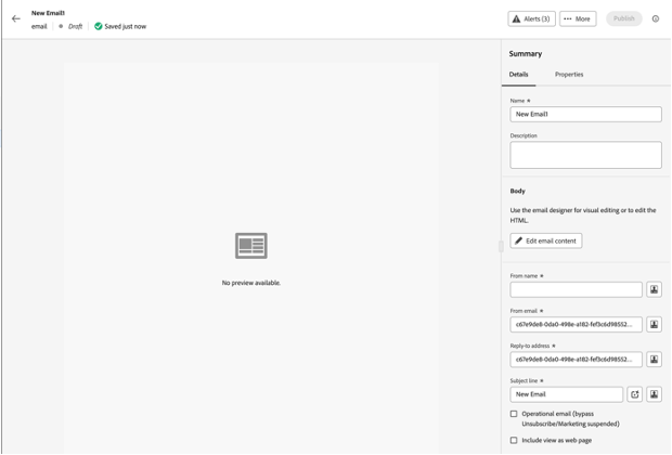 - Start a New Email: In Emails > Emails (New), click “Create Email.” Name it “Bodea-Welcome-Email” and set the subject as “Discover the Future of Tech at Bodea Inc!”