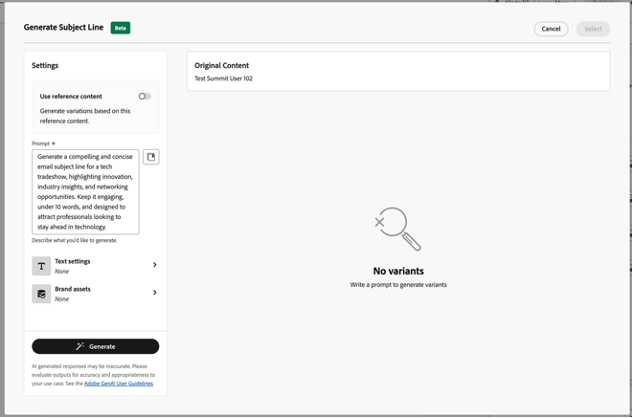 - Enter: “Generate a compelling subject line for a tech tradeshow thank-you, highlighting innovation, insights, and networking. Keep it engaging, under 10 words.”