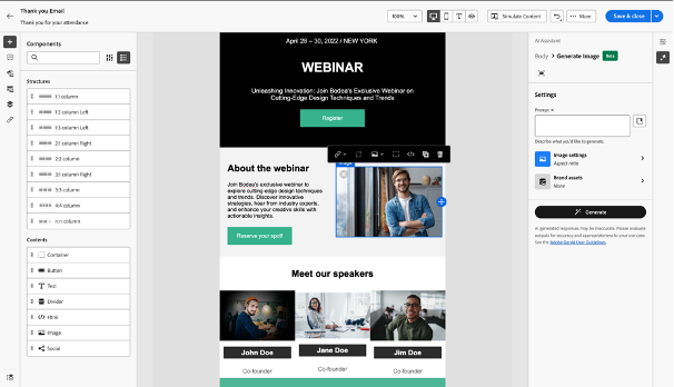 - Select an image placeholder, click the AI assistant icon, and enter: “Generate an image for a tech tradeshow thank-you, centered on innovation and networking opportunities in technology.”