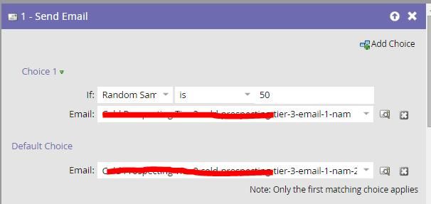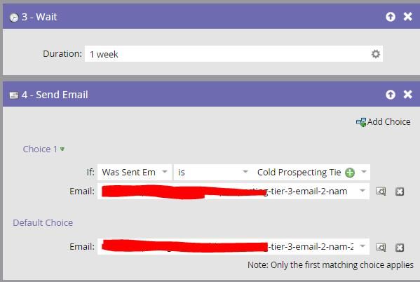 Then we wait a week (either by wait step in the dri[p nurture) or by cadence (for the engagement program). We use a choice step on send email here to say send the 2nd version A email if you have been sent version A of the 1st email, otherwise send version B of the second email.