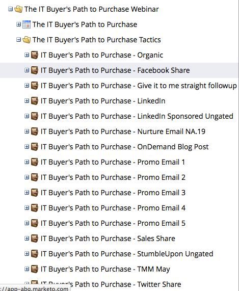 We also created a custom object in our CRM (Salesforce.com) where we can build the master campaign, and we then create parent-child relationships between each of the tactic campaigns and the master campaign. This way, our program owners have one place in Salesforce where they can check on the success of each tactic.