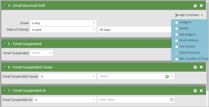 - The Email Suspend field is not fully searchable like Email Bounced and Email Bounce Soft - see below.