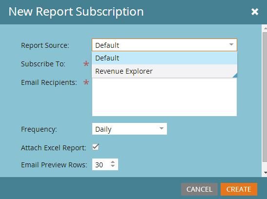 In anaytics section, click on Subscriptions tab next to Analytics tab, click on new subscription and click on Report Source and you will have two choices, Default and RCE.