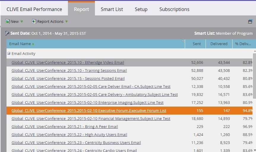 Here's how the numbers are reported in an Analytics Email report. The highlighted email shows 155 sends.
