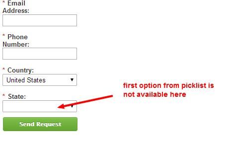 I'm using Visibility Rules to show/hide State/rProvince fields dynamically in my form. They are hidden until the user selects United States or Canada . If one of those is selected, the appropriate State/Province appears.. but the default "blank value" option does not come thorugh.