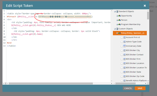 I'm trying to set up a script that references a Salesforce Object whose name includes brackets