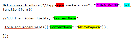 4. On the webpage that hosts the form, add a customized version of this code, so that when the form is loaded, you add a hidden field (highlighted in green) and pass a value into it to indicate which piece of content was retrieved (highlighted in yellow). Be sure to customize the code with your pod (highlighted in red), your account string (highlighted in purple) and the form ID (highlighted in blue).